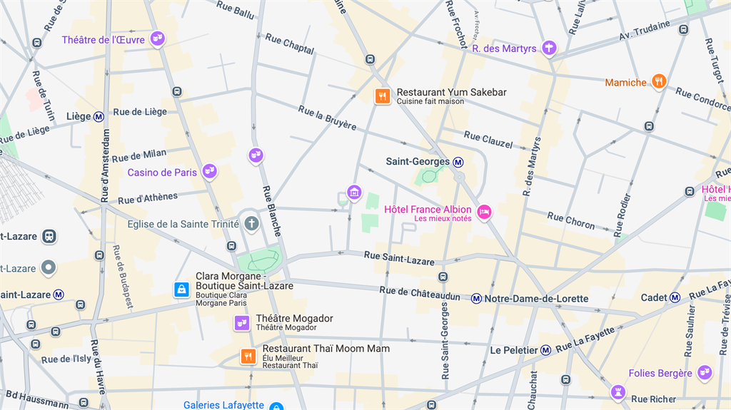 Enseignes à proximité Moulin Rouge, La Cigale, Élysée Montmartre, La Boule Noire, Les Trois Baudets, Le Trianon, Galeries Lafayette Haussmann, Citadium, Carrefour, Hema, etc...